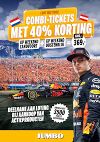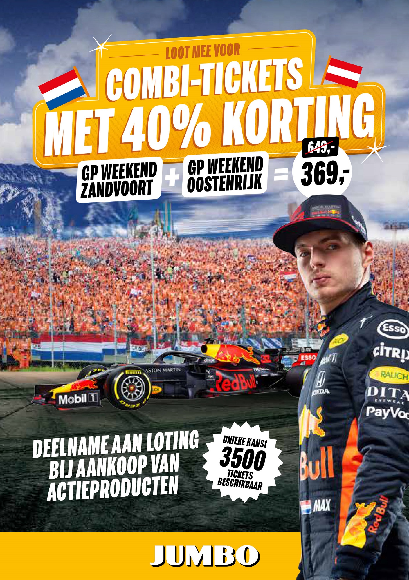 'Het is een unieke kans voor iedereen die Max aan het werk wil zien tijdens de Formula 1 Heineken Dutch Grand Prix én de GP in Oostenrijk', promoot Jumbo de actie. De reguliere kaartverkoop voor de Formule 1 in Nederland ging hard, maar Jumbo heeft nog 3500 kaarten beschikbaar. Die tickets zijn dus niet alleen geldig voor het GP-weekend in Zandvoort (vanaf 1 mei 2020), maar ook voor het GP-weekend in Oostenrijk begin juli.