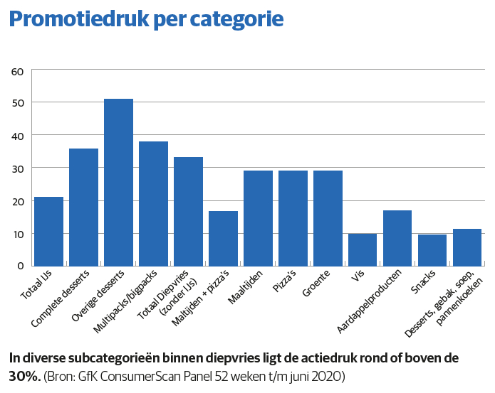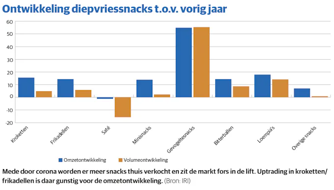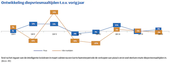 Iets soortgelijks is aan de gang in snacks, groente en fruit en in mindere mate vis. Schouten: ‘Als de horeca dicht is, maak je het thuis toch gezellig met bitterballen, natuurlijk heeft dat een positief effect op de verkoop.’ Ook na het openen van de horeca in juni bleven de diepvriesverkopen relatief hoog, signaleert Jessy Hommen, strategic insights analist bij IRI. Corona is volgens haar geen tijdelijk effect gebleken, zoals bij toiletpapier. ‘Waar veel categorieën te maken hadden met een hamsterperiode en de groeicijfers na de eerste piek vrij snel weer afzwakten, hielden de hogere verkopen voor een aantal diepvriescategorieën langer aan. Consumenten zijn meer van deze producten gaan en blijven consumeren. In de laatste twee periodes zijn de groeicijfers wel iets afgenomen, doordat horecabedrijven hun deuren weer mochten openen.’