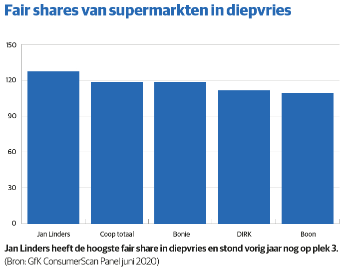 De groei in diepvries ziet er goed in, maar zet die door? Te meer omdat de vaak dubbele groeicijfers deels aan corona zijn te koppelen. ‘Zeker bij de stijging dit voorjaar’, besluit Van den Berk. ‘Die groei kwam mede uit meer kopers van diepvries oftewel een hogere penetratie.’ Hij laat er een rekensommetje op los om dit in perspectief te plaatsen. ‘Als de penetratie met 5 procentpunten stijgt, ofwel 400.000 huishoudens extra, zoals in aardappelproducten, dan stappen er grote groepen nieuwe consumenten in. Je ziet dit soort groei ook terug in de hogere marktaandelen van groentespeciaalzaken, bakkers en slagers.