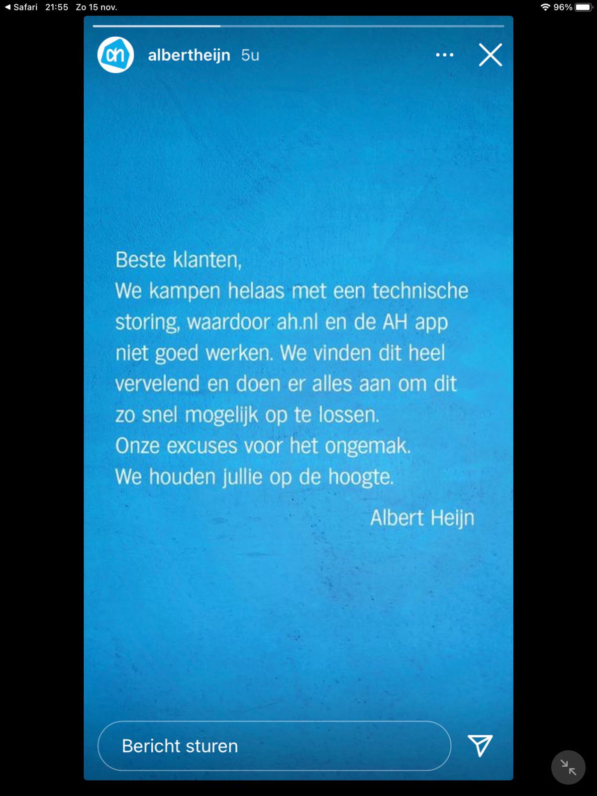 Albert Heijn meldde de storing onder andere via Instagram. ‘We kampen helaas met een technische storing waardoor AH.nl en de AH-app niet goed werken. We vinden dit heel vervelend en doen er alles aan dit op te lossen.’