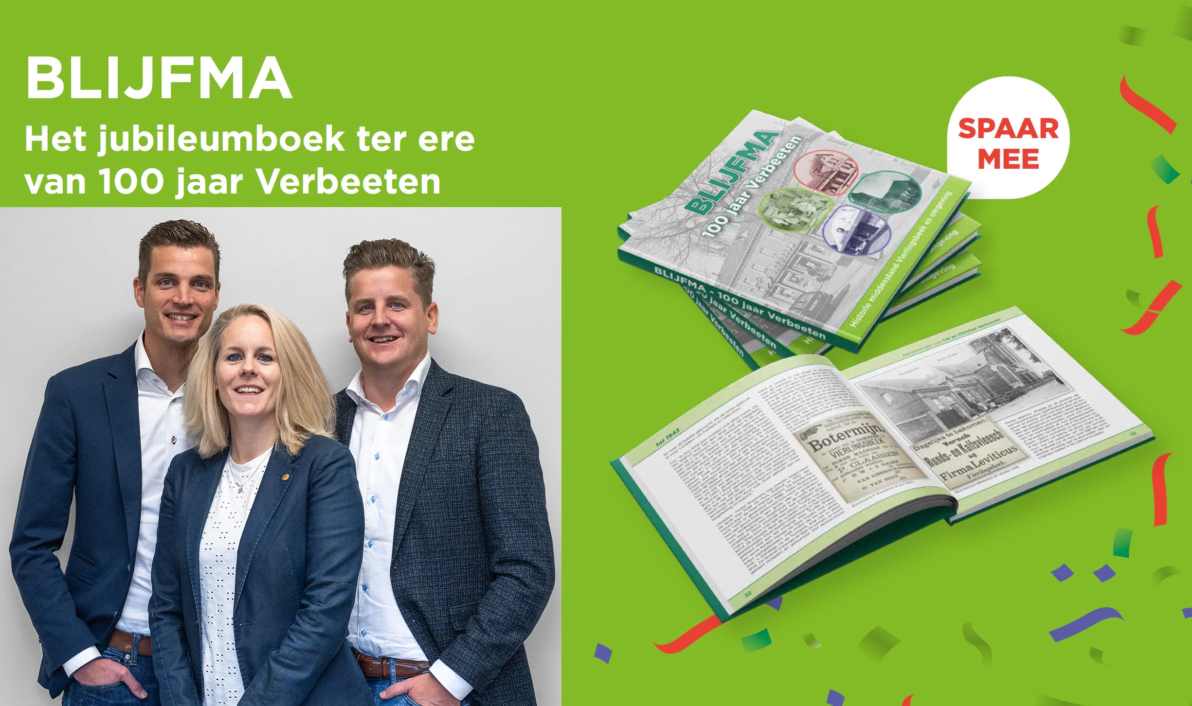 Het boek heeft als titel ‘Blijfma, 100 jaar Verbeeten’ meegekregen. Het beschrijft meer dan de al uitgebreide geschiedenis van Plus Verbeeten alleen. Het is een kroniek van de historie van de middenstand en bevolking van Vierlingsbeek en het nabijgelegen Overloon. Dat gebeurt in drie tijdsperiodes, tot 1943, van 1944 tot 1971 komen onder meer de oorlogsjaren aan de orde, in de omgeving is hard gevochten.