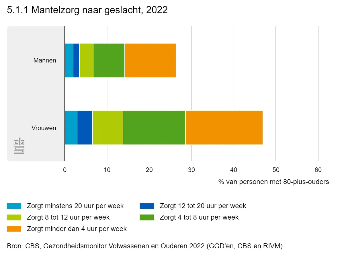 Dat treft veel werkenden. Van alle mantelzorgers is 68% jonger dan 65 jaar. De meeste mantelzorg wordt gegeven door personen in de leeftijd van 45 tot 70 jaar. Binnen die groep gebeurt dat het meest door 55- tot 60-jarigen: van hen gaf 24% in 2022 mantelzorg. En de meesten van hen zijn dus vrouwen.